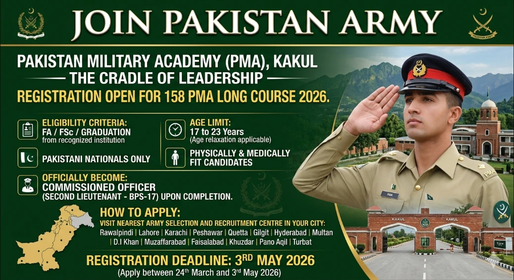 Pakistan Military Academy (PMA), Kakul — the Cradle of Leadership — has officially opened registrations for 158 PMA Long Course 2026. This is a prestigious opportunity for young Pakistani men to join the Pakistan Army as commissioned officers at the rank of Second Lieutenant (equivalent to BPS-17). Registration is open from 24 March to 3 May 2026 and can be completed online or through the nearest Army Selection and Recruitment Centre across Pakistan. Candidates with FA, FSc, or Graduation qualifications between the ages of 17 to 23 years are eligible to apply. This is one of the most honoured career paths available to the youth of Pakistan.