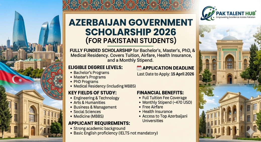 The Azerbaijan Government Scholarship 2026 is a fully funded international opportunity designed for students from Pakistan to pursue Bachelor’s, Master’s, PhD, and Medical Residency programs. This prestigious program covers tuition fees, airfare, health insurance, and provides a monthly stipend, making it an ideal option for students aiming to study abroad without financial burden. With a wide range of fields including engineering, medicine, and social sciences, this scholarship is perfect for academically strong and motivated candidates seeking global exposure and high-quality education.