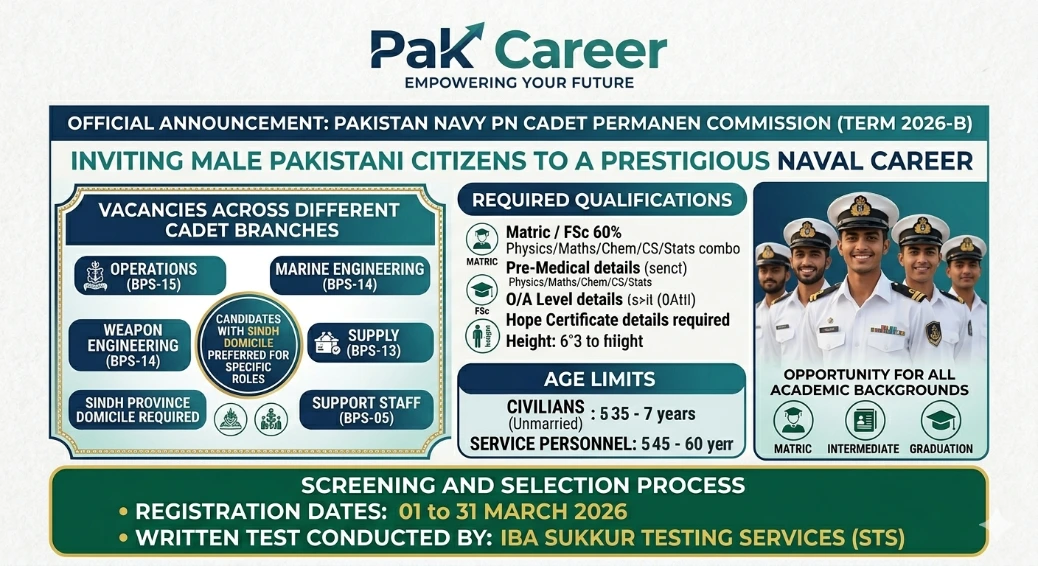 Pakistan Navy has officially announced recruitment for PN Cadet Permanent Commission Term 2026-B, inviting male Pakistani citizens to begin a prestigious naval career. Candidates must have passed both Matric and FSc / O-A Level with minimum 60% marks in Physics, Maths & Chemistry / Computer Science / Statistics combination. Age limit is 16½ to 21 years for civilians (unmarried) and 17 to 23 years for serving armed forces personnel. Minimum height required is 5 feet 4 inches. Registration is open 01 to 31 March 2026 through the official Pakistan Navy website. Recruitment and Selection Centers are available across 19 cities nationwide.